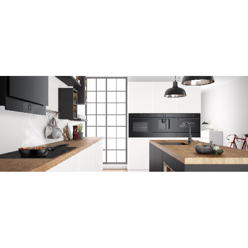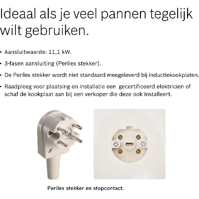 De Bosch PIV975DC1E inductiekookplaat beschikt over een PerfectFry-functie waardoor jij makkelijk een lekkere biefstuk kan bereiden. Er wordt een signaal gegeven wanneer de olie op de juiste temperatuur is. Op dat moment kan jij de biefstuk in de pan doen. Kies uit 5 verschillende vermogensstanden. De BraadSensor houdt de temperatuur in de pan constant op 1 van deze vermogensstanden. De inductiekookplaat herkent met de QuickStart-functie op welke kookzone jij een pan hebt geplaatst. Stel alleen nog de temperatuur in op het DirectSelect Premium-bedieningspaneel. Het vermogen van de kookzones worden tot maximaal 50% verhoogd dankzij de PowerBoost-functie. Het opwarmen van de pan kan in 30 seconden met de PanBoost-functie. Hierdoor kan jij nog sneller aan tafel schuiven. De inductiekookplaat beschikt over een driekrings kookzone. Deze zone bestaat uit 3 ringen, waardoor jij 3 verschillende pan groottes kan gebruiken. Ben je vergeten hoelang de spaghetti aan het koken is? Start de count-up timer zodra je de spaghetti in de pan doet. Zo kan jij goed in de gaten houden wanneer de spaghetti klaar is. De Bosch PIV975DC1E beschikt over een comfort profiel-design met een schuin aflopende voorkant en metalen strips aan de zijkanten. Let op! Bij een inductiekookplaat wordt geen stekker meegeleverd, omdat deze geïnstalleerd dient te worden door een elektricien. Bestel deze Perilex-stekker er los bij.