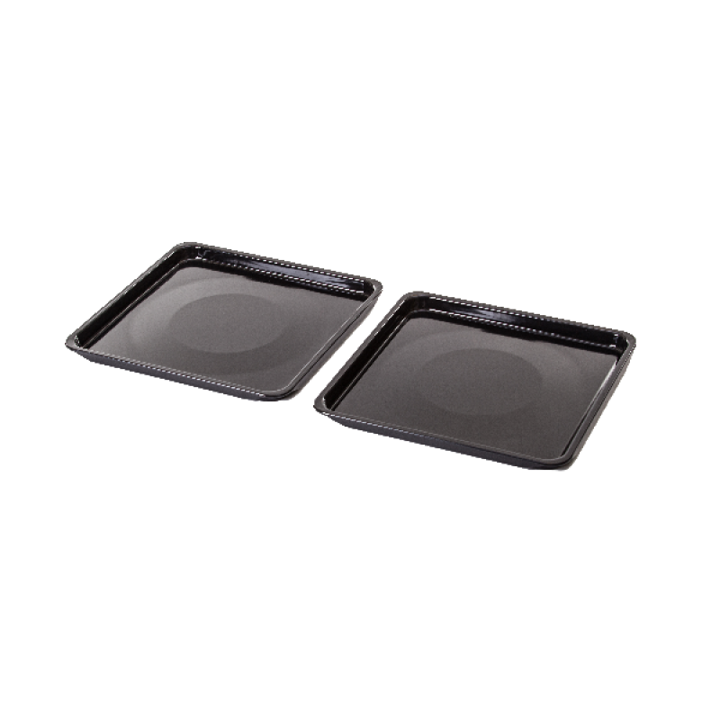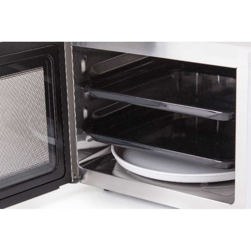 Het schoonmaken van de magnetron hoeft niet lang te duren. De binnenkant is volledig van roestvrij staal, wat betekent dat je het in een handomdraai schoonveegt. Ook de beide vierkante bakplaten vergen niet veel onderhoud: omdat ze geëmailleerd zijn, zijn ze lekker snel schoon. Je schuift deze bakplaten bovendien heel eenvoudig in en uit de oven en legt ze na bereiding zorgeloos op het aanrecht. De overige accessoires van de R971INW bestaan uit een witte, keramische draaiplaat en twee rekjes met verschillende hoogtes.