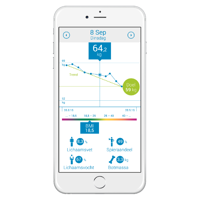 De Medisana lichaamsanalyseweegschaal BS 444 connect biedt je alles wat je nodig hebt om je gewichtsverloop volledig te monitoren. De weegschaal verbind je via Bluetooth met de VitaDock+-app op je smartphone of tablet. Deze app houdt je vorderingen gedetailleerd bij en geeft je tips hoe je je doelen op een gezonde manier kunt bereiken. De BS 444 analyseert je lichaam volledig; de hoeveelheid lichaamsvet, -vocht, bot- en spiermassa wordt nauwkeurig gemeten. Daarnaast berekent hij je BMI en stelt hij je dagelijkse caloriebehoefte vast. De BS 444 connect herkent automatisch 8 verschillende gebruikers. Zo zorgt hij ervoor dat de meetresultaten op de juiste manier aan de app worden doorgegeven. De 4 nauwkeurige DMS-sensoren zorgen ervoor dat de Medisana BS 444 connect je meetresultaten exact weergeeft.