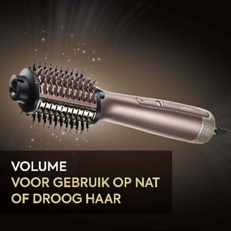 De föhnborstel Air Power Volume AS95E van Babyliss in goud zorgt voor glanzend en volumineus haar met een professionele afwerking. Met een vermogen van 1.000 watt en een ovale borstel van 7,2 cm bereik je eenvoudig een volle, veerkrachtige blow-out, geschikt voor lang en middellang haar. Dankzij de Wet & Dry-functie gebruik je de borstel om nat haar te drogen of droog haar opnieuw in model te brengen, zodat je kapsel er altijd verzorgd uitziet. De keramische vinnen en polijstende borstelharen met ionische technologie verminderen pluis en statisch haar voor een glad en glanzend resultaat. De brede borstel tilt het haar bij de wortel voor extra volume tot in de punten, terwijl de coolshot-functie de look fixeert voor langdurige resultaten. Met 3 temperatuurstanden, 2 snelheden, oververhittingsbeveiliging en een 2,5 meter lange kabel biedt deze föhnborstel gebruiksgemak en controle bij het stylen.