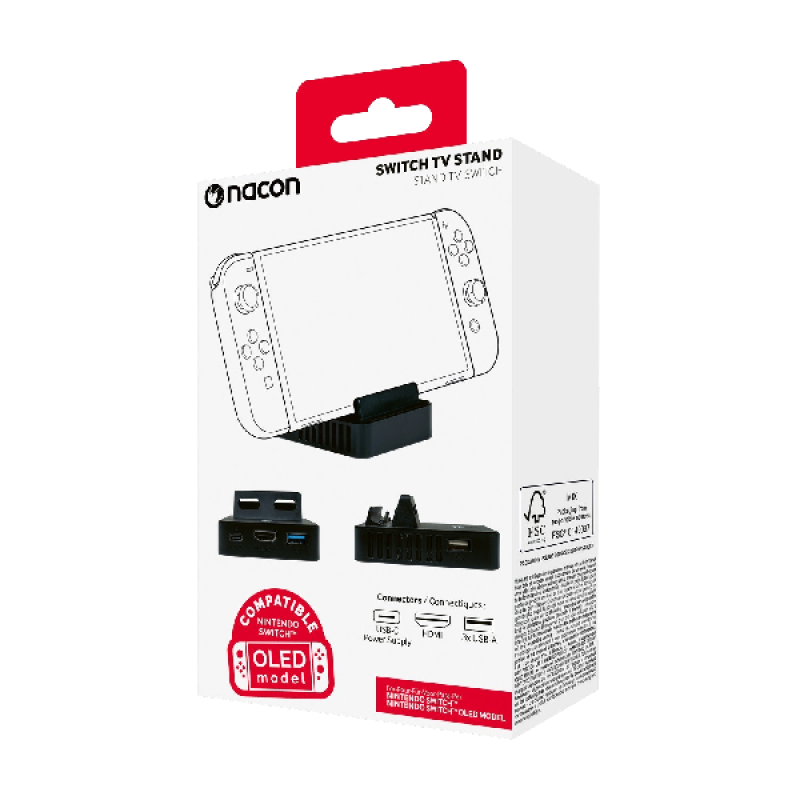 Houder om je Nintendo Switch of Nintendo Switch OLED-Model via HDMI met een TV of een computerscherm te verbinden (kabel niet inbegrepen).• Stroomvoorziening via de adapter (niet inbegrepen) met de achterste USB-C poort werkt met de officiële lader van de Nintendo Switch). 3 USB-A poorten om je controller of koptelefoon aan te sluiten. HDMI 2.0-poort, ondersteunt beeld in 1920x1080 bij 60 FPS.