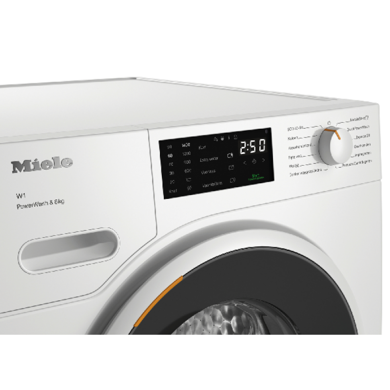 Met de Miele WWB 360 WCS PowerWash haal jij een zuinige krachtpatser in huis. Deze wasmachine met 8 kilo vulgewicht en stoomfunctie wordt aangedreven door een krachtige, duurzame en stille ProfiEco-motor, die bijdraagt een de lage energieklasse: maar liefst 20% zuiniger dan energielabel A. Ook de slimme beladingsherkenning helpt hierbij. Die meet hoe zwaar je waslading is en past hier vervolgens het water- en stroomverbruik op aan. Zo gebruikt hij alleen wat je nodig hebt, en niet meer. Dankzij PowerWash kun jij bovendien keer op keer rekenen op een grondige reiniging met minimaal verbruik. Door het water en wasmiddel gelijkmatig te verdelen, wordt het wasgoed zeer efficiënt en snel gereinigd. Dit merk je met name bij QuickPowerWash: door slim gebruik te maken van het Spin&Spray-systeem wast de machine een volledige lading in slechts 49 minuten. Zonder in te boeten op wasprestaties. De SoftCare-trommel is daarnaast zo ontworpen dat je kleding beter wordt beschermd, zodat je langer van je faoriete outfits kunt genieten. Heb je kleding die een speciale behandeling nodig heeft? Deze wasmachine van Miele heeft een lade voor CapDosing-capsules (afzonderlijk verkrijgbaar). Hiermee geef jij jouw wasgoed een grondige behandeling op maat. Wil je nog meer uit deze Miele-wasmachine halen? Koppel hem dan met de Miele@home-app voor nog veel meer mogelijkheden.