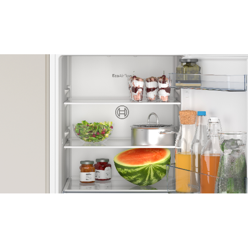 Heldere ledverlichting zorgt ervoor dat je altijd goed zicht hebt op de inhoud van de koelkast. Dankzij het sleepdeur-systeem is de inbouw eenvoudig en sluit het apparaat naadloos aan op je keukenkastjes. Voor modellen met Home Connect-technologie biedt Bosch extra comfort: je kunt de verlichting en functies via een app bedienen.