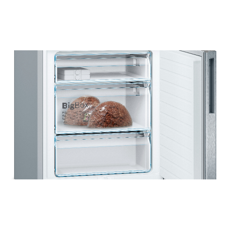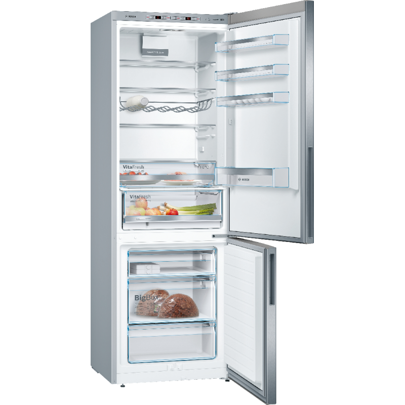 De Bosch KGE49AICA is maar liefst 70 centimeter breed en heeft een riante inhoud van 419 liter. Daarmee is deze koelvriescombinatie 10 centimeter breder dan reguliere koelkasten en biedt hij genoeg ruimte voor al jouw koelwaren. Je kunt jouw boodschappen bijvoorbeeld makkelijk kwijt op 1 van de 5 plateaus in de koelkast, waarvan 2 in hoogte verstelbaar zijn en 4 uitschuifbaar. Flessen blijven stevig liggen op het flessenrooster en grote diepvrieswaren kun je kwijt in de grote BigBox-lade. De koelkast beschikt bovendien over handige functies. Het VitaFresh-vershoudsysteem bijvoorbeeld, streeft een extra lange houdbaarheid van voedsel na. Zo heeft de onderste lade exact de juiste luchtvochtigheid, waardoor de versheid, smaak en voedingswaarden van groente en fruit langer behouden blijft. De bovenste VitaFresh-lade is een 0 graden-zone, waarin je worst, kaas, vlees en vis goed bewaart. Het vriesgedeelte van de Bosch KGE49AICA heeft ook genoeg functionele eigenschappen. Zo hoef jij deze niet alleen minder vaak te ontdooien dankzij LowFrost, dat de vorming van ijs vermindert, maar beschikt hij ook over automatisch SuperVriezen. Deze functie wordt automatisch geactiveerd als de vriezer temperatuurwijziging detecteert. Nieuwe etenswaren worden dan snel ingevroren en reeds geplaatste producten blijven goed bevroren.