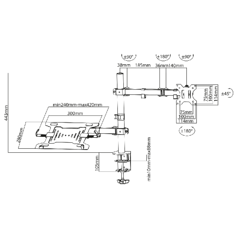 De AC8305 Monitor Bureausteun met laptoparm creëert een ergonomische en plaats besparende werkplek. Bevestig de monitorsteun op of door een bureau (max. tafeldikte 88mm). Plaats eenvoudig een scherm tot 32” en 8kg op de AC8305 met het beeldschermmontagesysteem. De arm met daaraan de laptopsteun is geschikt voor een laptop tot 15,6” en 4kg. De steun heeft drie knikpunten voor het instellen van de ideale kijkafstand. De monitor en de laptop zijn op de gewenste kijkhoek te plaatsen door deze te kantelen, te roteren of te zwenken. De kabels kunnen worden weggewerkt met het kabelmanagementsysteem.