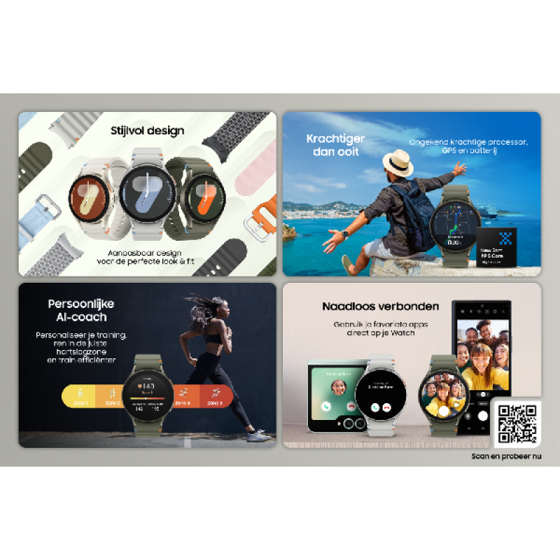 Niet alleen de buitenkant van deze Samsung-smartwatch is robuust: ook aan de binnenkant is hij een echte krachtpatser. De Galaxy Watch7 is uitgerust met een 3nm-chipset die voor soepele en snelle prestaties zorgt. En dankzij deze chipset maakt de watch ook efficiënter gebruik van de batterij. Hierdoor gaat de batterij tot wel 2 dagen mee. Ren dus gerust die marathon! Ook het dubbele GPS-systeem komt bij afstandssporten goed van pas. Je geniet namelijk van zeer nauwkeurige locatiebepaling, zelfs in een dichte omgeving. Dus, welke route neem jij?