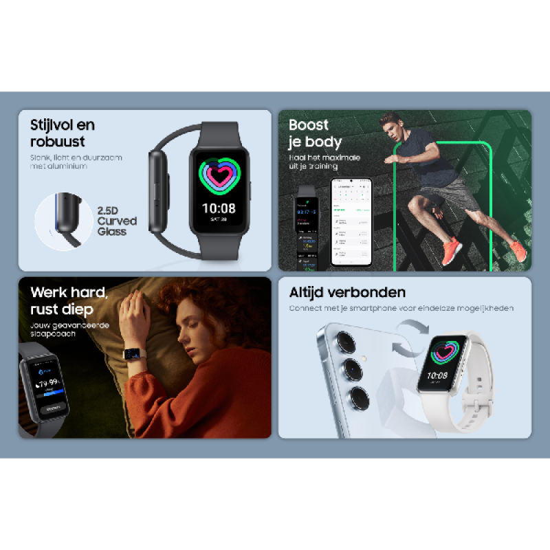 De Galaxy Fit3 heeft een helder, rechthoekig 1.6-inch-scherm. Lekker veel ruimte om je watch comfortabel te bedienen en veel informatie te zien in één oogopslag. Dankzij het slanke en lichtgewicht design merk je nauwelijks dat je de Fit3 draagt. De dunne aluminium behuizing weegt namelijk slechts 18,5 gram. Wel zo fijn tijdens een intensieve work-out. Dit horloge is bovendien niet alleen comfortabel, maar ook stijlvol. Met meer dan 100 verschillende wijzerplaten om uit te kiezen, verander je de look van je smartwatch met enkele drukken op de knop. Dus kies je favoriet of pas de wijzerplaat op de gelegenheid aan.