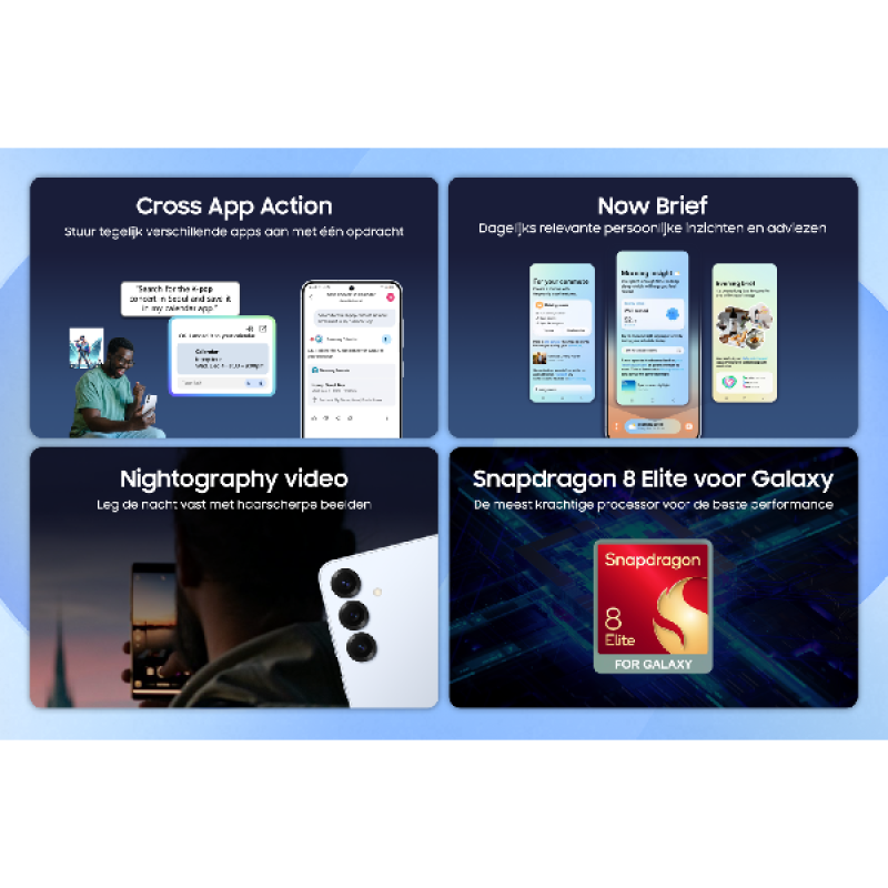 De Samsung Galaxy S25 5G 256GB Blue Black is je nieuwe, geavanceerde krachtpatser. Met Android 15 en de revolutionaire Snapdragon 8 Elite processor ervaar je ongekende snelheid en soepelheid. Dankzij 256 GB opslag en maar liefst 12 GB werkgeheugen schakel je razendsnel tussen apps, games en camera. De Full AI van deze smartphone verbetert bovendien je gebruikerservaring op alle fronten. Verder leg je adembenemende foto's vast met de haarscherpe 50 MP triple camera en 12 MP frontcamera, en film je zelfs in 8K. Het heldere 6,2-inch (15,75 cm) Full HD+-display met Gorilla Glass en HDR10+ zorgt voor een levendige en duurzame kijkervaring. Daarnaast ben je altijd verbonden dankzij 5G, Dual-SIM en NFC. Tot slot is deze stijlvolle smartphone volledig stof- en waterdicht (IP68) en laad je de 4.000 mAh-batterij razendsnel draadloos op.