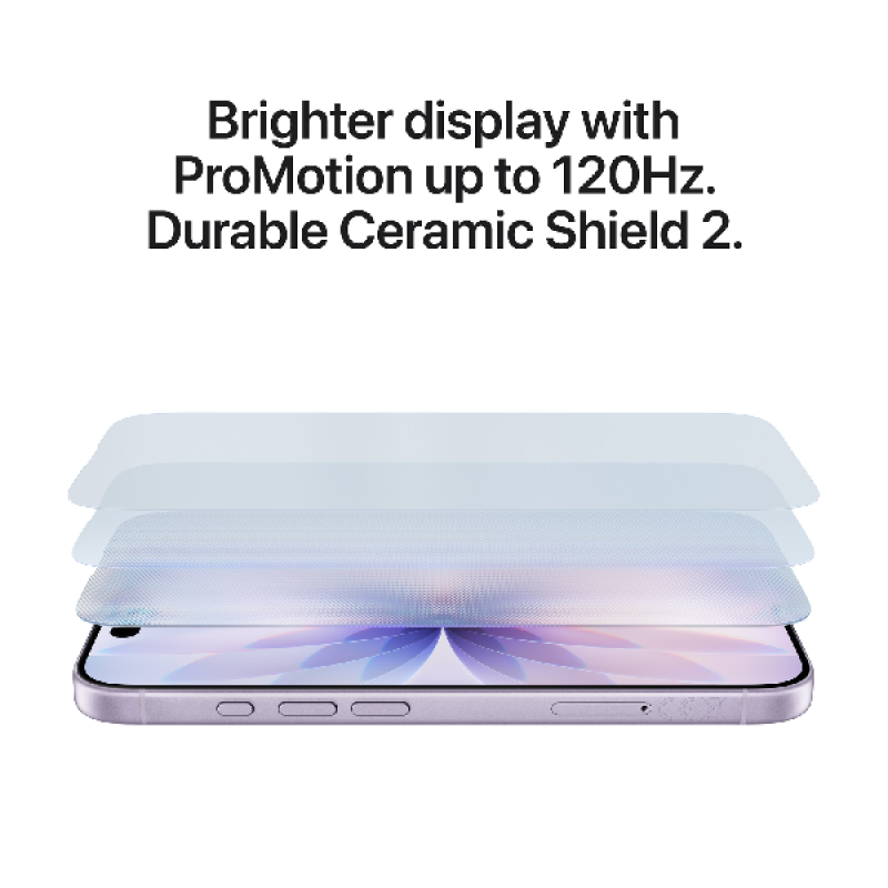 De iPhone 17 is er in 5 sprekende kleuren, met een helderder 6,3-inch display en een voorkant van ceramic shield 2, dat 3x zo krasbestendig is. Het 6,3-inch display is helderder, briljant en biedt soepeler scrollen met promotion tot wel 120 Hz, een beter contrast in de buitenlucht met 3.000 nits piekhelderheid en 33% minder spiegeling.