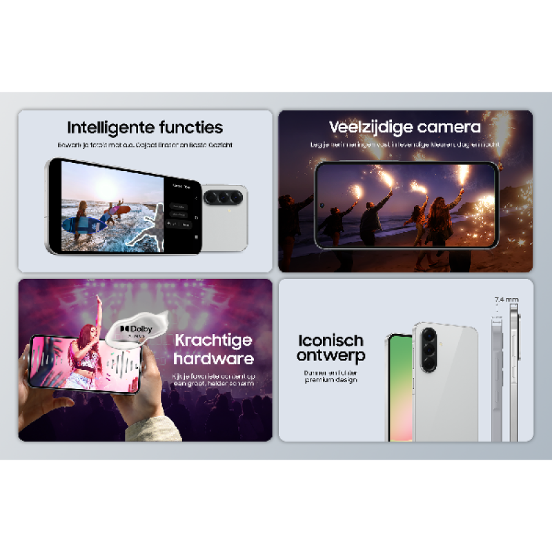 Met een dikte van slechts 7,4 mm en een gewicht van 198 g is de Galaxy A56 zowel dun als licht en biedt hij een comfortabele grip. Het metalen frame en de Corning Gorilla Glass Victus+ achterkant geven het toestel een aanzienlijke mate van robuustheid. Met zijn Awesome Pink Graphite combineert deze smartphone elegantie en prestaties. Hij beschikt over een drievoudig camerasysteem aan de achterkant met 5, 12 en 50 MP en een 12 MP camera aan de voorkant. Dankzij de Nightography technologie kun je scherpe, heldere foto's maken in alle lichtomstandigheden.
