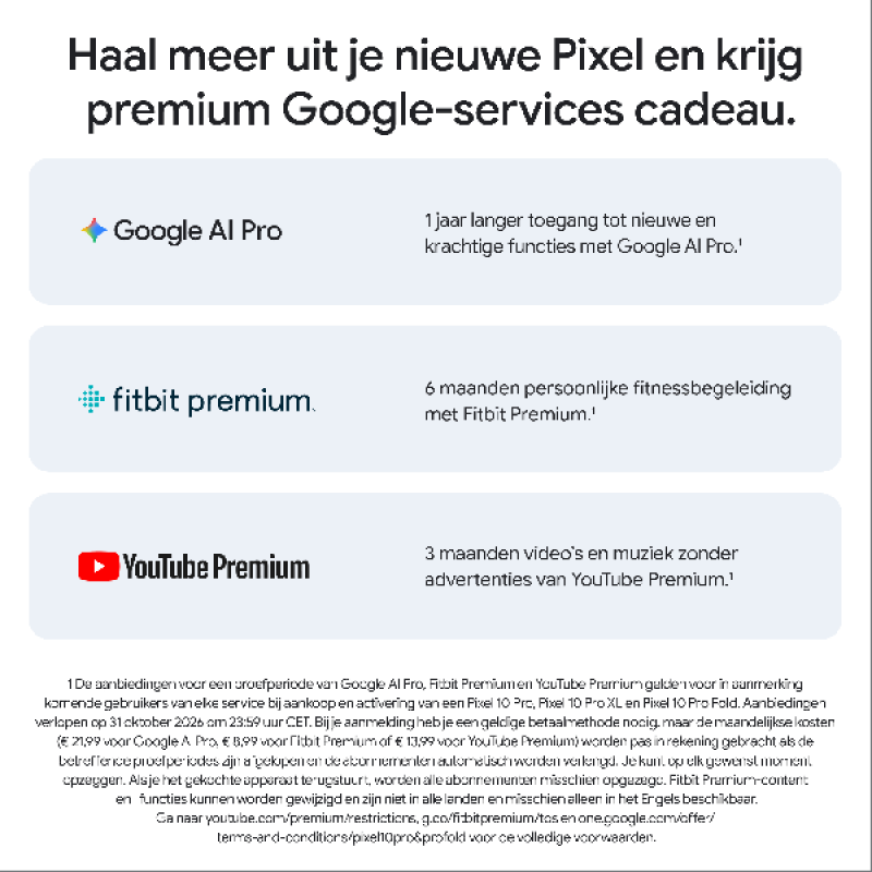 De Google Pixel 10 PRO is een high-end smartphone ontworpen om je een vloeiende, intelligente en elegante ervaring te bieden. Hij heeft een 6.7-inch LTPO Full HD+ OLED-scherm met een indrukwekkende helderheid van 3.000 nits, waarop je zelfs in direct zonlicht elk detail helder te zien krijgt. Google heeft de Pixel 10 PRO uitgerust met de nieuwe Tensor G5-processor , die een betere energie-efficiëntie, stabielere prestaties en een betere integratie met Android 15 verzekert. Met 16 GB RAM en tot 1 TB opslagruimte kun je naadloos browsen, gamen en je creatief uitdrukken. De batterij van 5250 mAh garandeert een lange gebruiksduur, met snel opladen of draadloos opladen met Qi2. De Google Pixel 10 PRO is IP68-gecertificeerd, wat betekent dat hij water- en stofbestendig is, zodat je hem zonder zorgen mee kunt nemen op al je avonturen. Het Pixel 10 PRO-model gemaakt van glas en aluminium is stevig en verkrijgbaar in 3 kleuren: Obsidian zwart, Porcelain wit en Moonstone grijs.