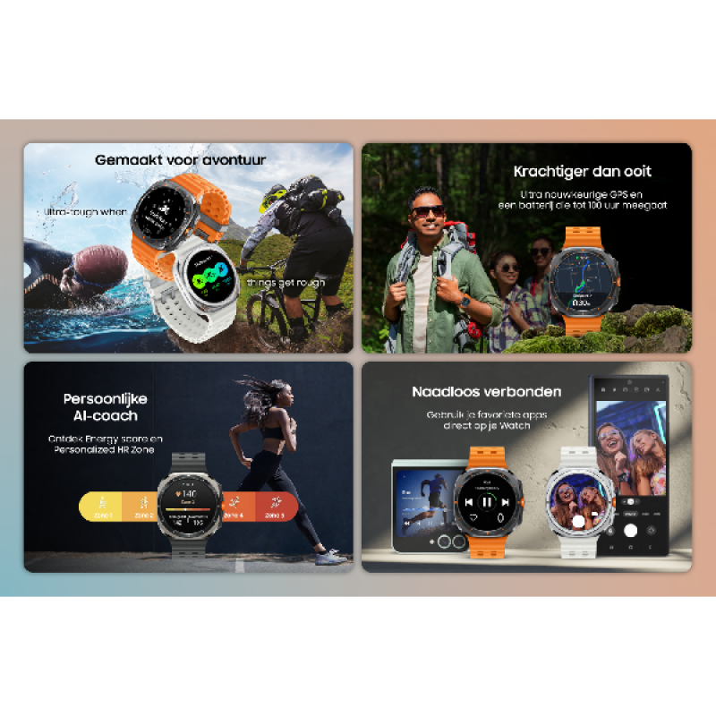 Deze smartwatch is uitgerust met diverse fitnessfuncties en gezondheidstracking, waaronder hartslagmeting, bloeddrukmonitoring en slaaptracking. Met LTE-connectiviteit blijf je verbonden zonder je smartphone, zodat je oproepen kunt beantwoorden en berichten kunt ontvangen. Daarnaast biedt de smartwatch ondersteuning voor wifi, bluetooth 5.3 en NFC voor veelzijdige connectiviteitsopties. De Dual-Frequency GPS zorgt voor nauwkeurige locatiebepaling, zelfs in dichtbebouwde gebieden, wat ideaal is voor buitenactiviteiten en navigatie. Bovendien is de Galaxy Watch Ultra compatibel met diverse sportprofielen, zoals fietsen en hardlopen, en biedt het ondersteuning voor contactloos betalen via Samsung Pay.