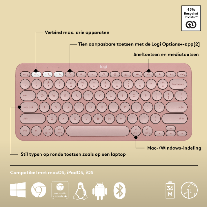 LOGITECH Pebble Keys 2 K380s Bluetooth-toetsenbord voor meerdere apparaten - Rose