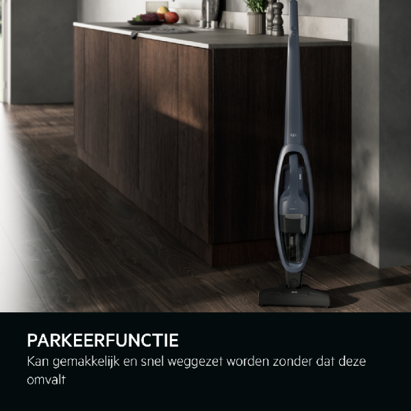 Ben je klaar met het stofzuigen, dan kan je de stofzuiger dankzij de parkeerstand gemakkelijk rechtop laten staan en hem opladen bij elk stopcontact.