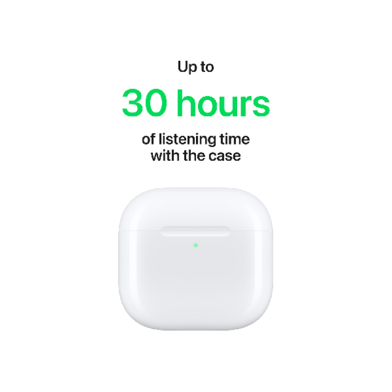 De gestroomlijnde oplaad­case is meer dan 10 procent compacter dan die van de vorige generatie, terwijl het opladen nog steeds even snel gaat. AirPods 4 met actieve ruisonderdrukking hebben de kleinste draadloos oplaadbare case op de markt, die dankzij een ingebouwde speaker makkelijk terug te vinden is met ‘Zoek mijn’. De oortjes bieden tot 30 uur luistertijd met de case en tot 4 uur luistertijd na één keer volledig opladen met actieve ruisonderdrukking,