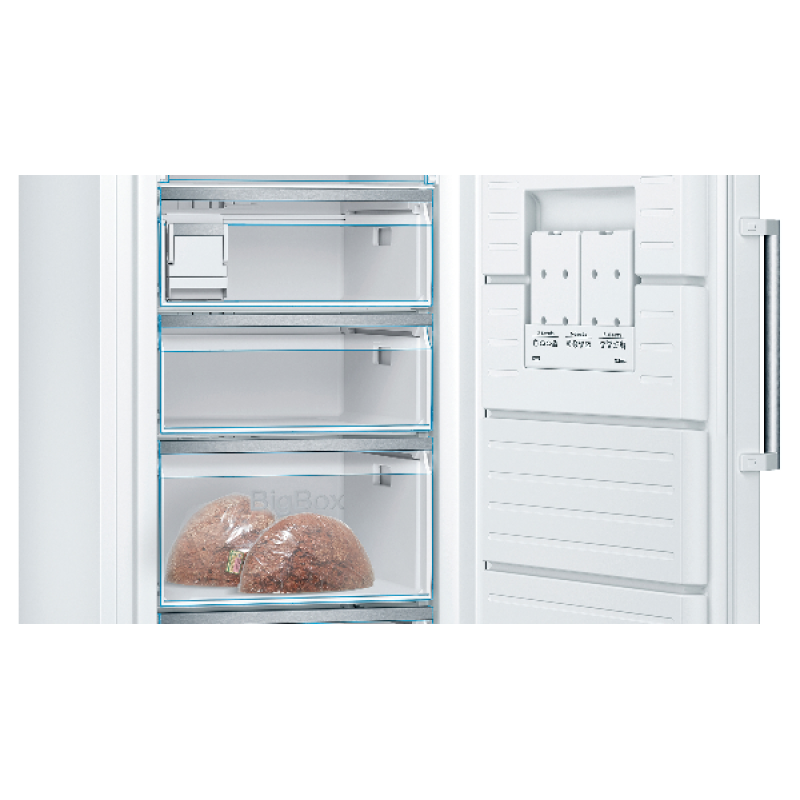 De Bosch GSN58AWCV is een energiezuinige vrieskast met NoFrost, SuperVriezen, FreshSense, maakt heerlijk koele drankjes met de ijsblokjes uit de IceTwister en heeft zelfs plek voor grote vriesproducten dankzij de BigBox lade. Deze BigBox lade is namelijk extra groot en hier kun je een taart of een stapel pizzadozen in kwijt. Nog steeds te weinig ruimte? Dankzij VarioZone is je vriezer flexibel in te ruimen met verstelbare glasplaten. Deze zijn inschuifbaar en uittrekbaar, zodat je altijd goed bij je producten kunt. Dit is een energiezuinige vriezer, doordat het klimaat constant blijft. Dit is niet alleen goed voor de energierekening, maar ook essentieel voor het behoud van smaak en vitamines van je etenswaar. De vriezer heeft namelijk FreshSense sensoren, deze pikken het verschil in temperatuur op en compenseren dit, ongeacht de buitentemperatuur. Hetzelfde geldt voor SuperVriezen. Dit is een automatische functie die, tijdens het inladen van je etenswaar, je ingevroren producten bevroren houdt, en nieuwe producten snel bevriest naar gewenste temperatuur. Ook dit is goed voor je levensmiddelen, maar ook voor de energierekening! Dankzij NoFrost technologie hoef je de Bosch GSN58AWCV nooit meer te ontdooien en is er nooit meer ijsvorming.