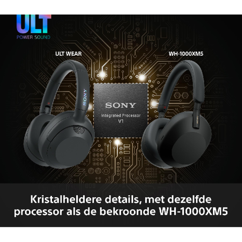 Maak kennis met de ULT Wear: met een krachtige bas, indrukwekkende ruisonderdrukking en audiotechnologieën van Sony's bekroonde WH-1000XM5 koptelefoon kun je de ULT POWER SOUND-ervaring overal mee naartoe nemen. Muziek luisteren is met de ULT Wear echt een plezier. De hoofdtelefoon zit bomvol Sony-technologie, zodat je geniet van verbluffend ULT Power Sound. De Sony Integrated Processor V1 en hoogwaardige drivers van 40 millimeter zorgen ervoor dat elke noot helder en gedetailleerd klinkt. Bovendien heeft de koptelefoon 2 ULT-geluidsmodi: Deep Bass versterkt lage frequenties en geeft extra diepte aan de muziek, en Attack Bass verhoogt de geluidsdruk voor meer volume, energie en kracht. Deze modi kies je heel eenvoudig met de ULT-knop op de oorschelp of met de handige Sony Music Centre-app.
