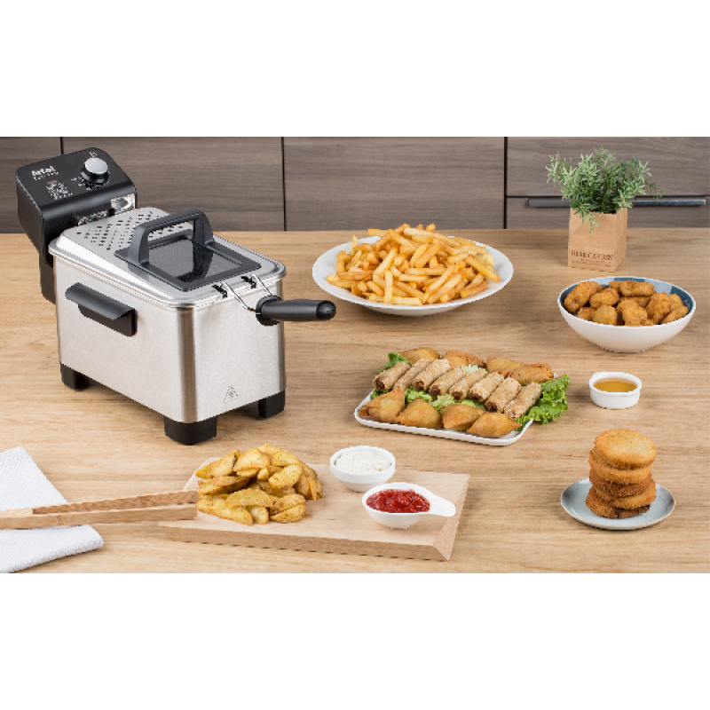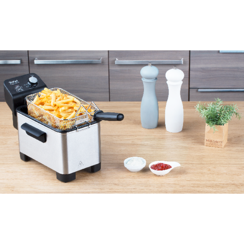 De Tefal Easy Pro Premium FR3380 friteuse heeft een vulhoeveelheid van 3 liter olie waar je per keer tot 1,2kg friet in bakt. Het is een semiprofessionele friteuse met koude zone-technologie. In deze zone onder het verwarmingselement wordt het frituurvet minder heet dan in de rest van de pan. Hier kunnen kruimels naar afdwalen waar ze minder snel verbranden, waardoor het frituurvet langer vers blijft. Verder is de RVS-binnenpan uitneembaar zodat je deze makkelijk kunt reinigen. Overigens zijn alle losse onderdelen, met uitzondering van het verwarmingselement, vaatwasserbestendig. Stel de temperatuur eenvoudig in met de draaiknop op de gewenste temperatuur tussen de 150°C en 190°C. Door het kijkvenster in het deksel kan je goed je frietjes in de gaten houden. Kortom, met Tefal Easy Pro Premium FR3380 bak jij met plezier heerlijke friet.