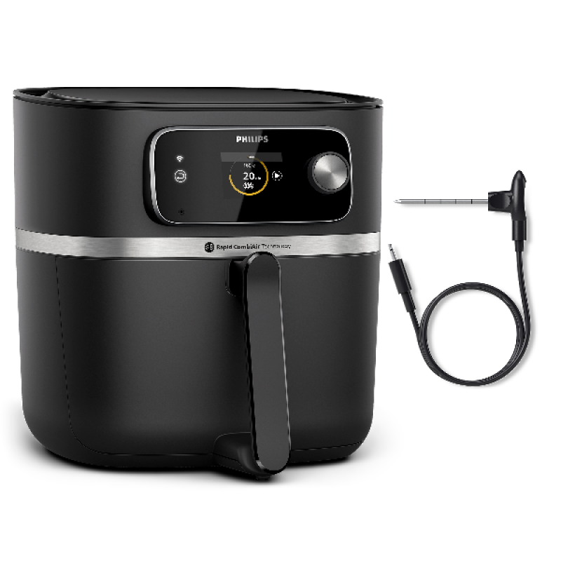 De complexiteit en het giswerk is van begin tot eind weggenomen met de Philips Airfryer Combi XXL Connected 7000 Series met geïntegreerde voedselthermometer. Dankzij de Rapid CombiAir-technologie heb je bereidingsmogelijkheden met hoge, lage en dynamische luchtsnelheden. Dit zorgt ervoor dat jouw voedsel altijd heerlijk mals is aan de binnenkant en je een gewenst niveau van krokantheid aan de buitenkant krijgt. Met de automatische bereidingsprogramma’s van Philips selecteer je eenvoudig jouw ingrediënt, bepaal je de hoeveelheid en laat je de Airfryer Combi de rest doen. Het koken met de Philips Airfryer Combi XXL Connected 7000 series is niet alleen gemakkelijk maar ook snel en zuinig.