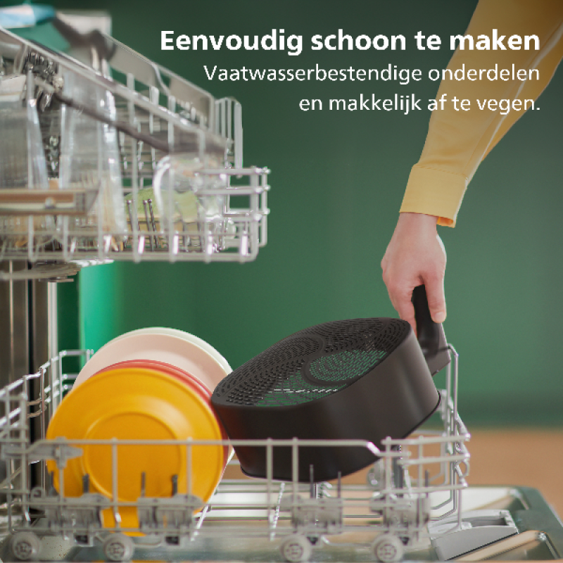 De Philips HD9875/90 heeft een extra grote capaciteit van 2 kg/8,3 liter waarmee je maaltijden voor 7 personen kunt maken. Je kan meer dan alleen frituren: grill, braad, bak, smoor, vacuümgaar, kook langzaam, rooster, droog, ontdooi en nog meer is allemaal mogelijk met deze Airfryer. Dankzij de geïntegreerde voedselthermometer kan je het perfecte stukje vlees, vis, of andere proteïne bereiden. Voor recepten en inspiratie kan je de Philips NutriU-app gebruiken. Hiermee kan je ook je bereidingsproces in de gaten houden. Wanneer je klaar bent met de bereiding maak je de Airfryer eenvoudig schoon doormiddel van de QuickClean.