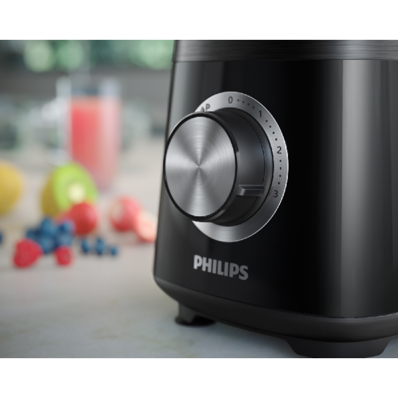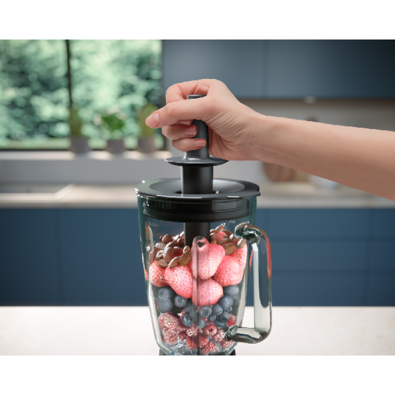 Als je geen extra vloeistof toevoegt, hebben bevroren fruitstukjes zelfs in de ProBlend Plus-kan soms een beetje hulp nodig om tot een lekkere smoothie te worden verwerkt. Met de meegeleverde stamper duw je de stukjes eenvoudig naar beneden, zodat je zeker weet dat alles wordt meegenomen. Zo kom je niet nog een hele framboos tegen in je drinkontbijt! En met de regelbare snelheid stem je de power van het apparaat eenvoudig af op de ingrediënten. Zo kun jij met van alles experimenteren. Inspiratie nodig? Dat vind je in de handige HomeID-app, samen met tips voor het gebruik van deze Philips-blender.